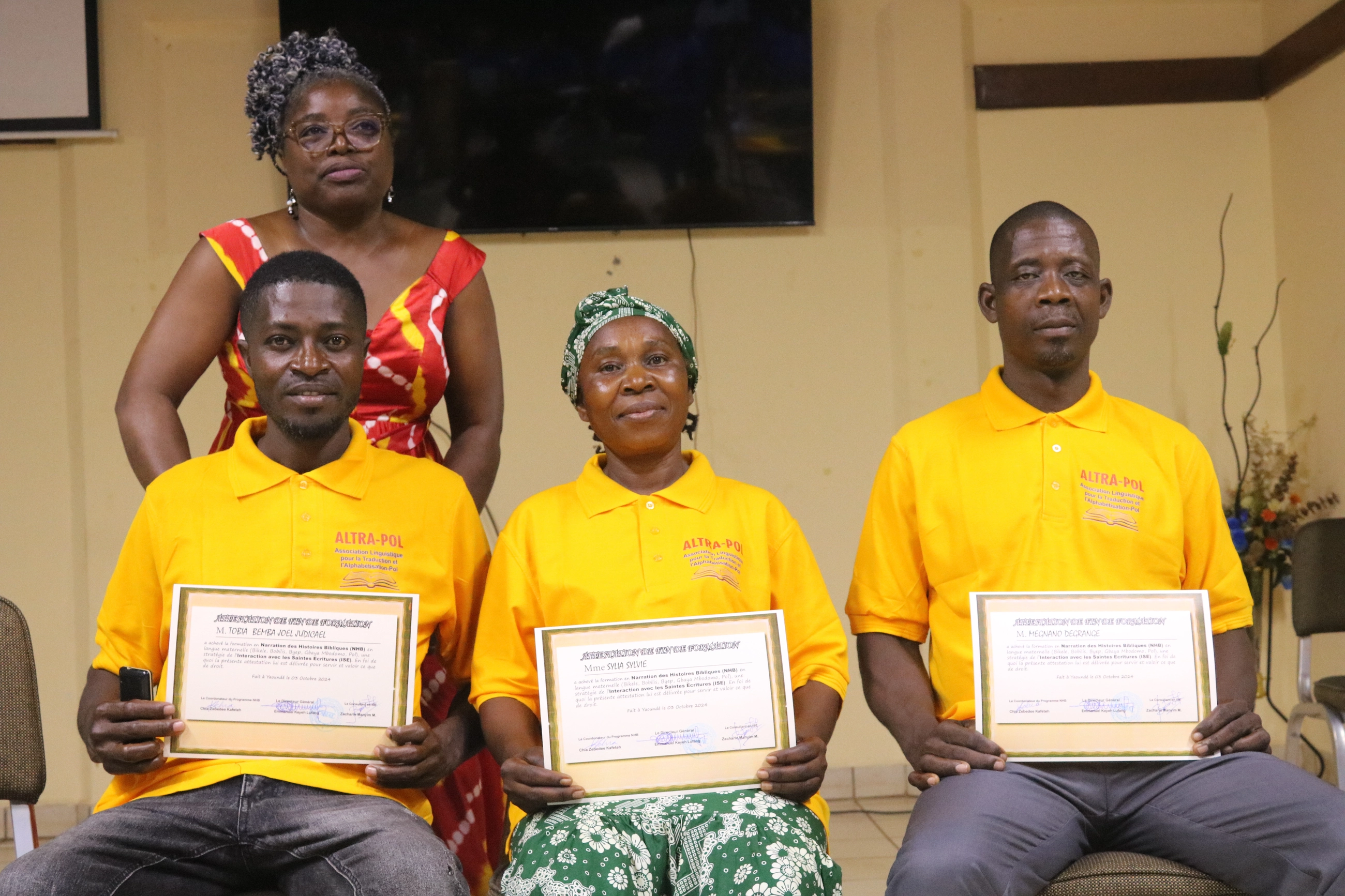 Aprés avoir suivit les formations par les formateurs échelonnés de la CABTAL pendant près de 02 (deux) ans, nous avons reçu différentes types de formations sur différents domaines tels que les techniques de Traductions, sur Paratext etc... les noms suivants ont été jugés apte de recevoir leurs attestation de fin de formation pour etre declaré Traducteurs de l'association ALTRAPOL.