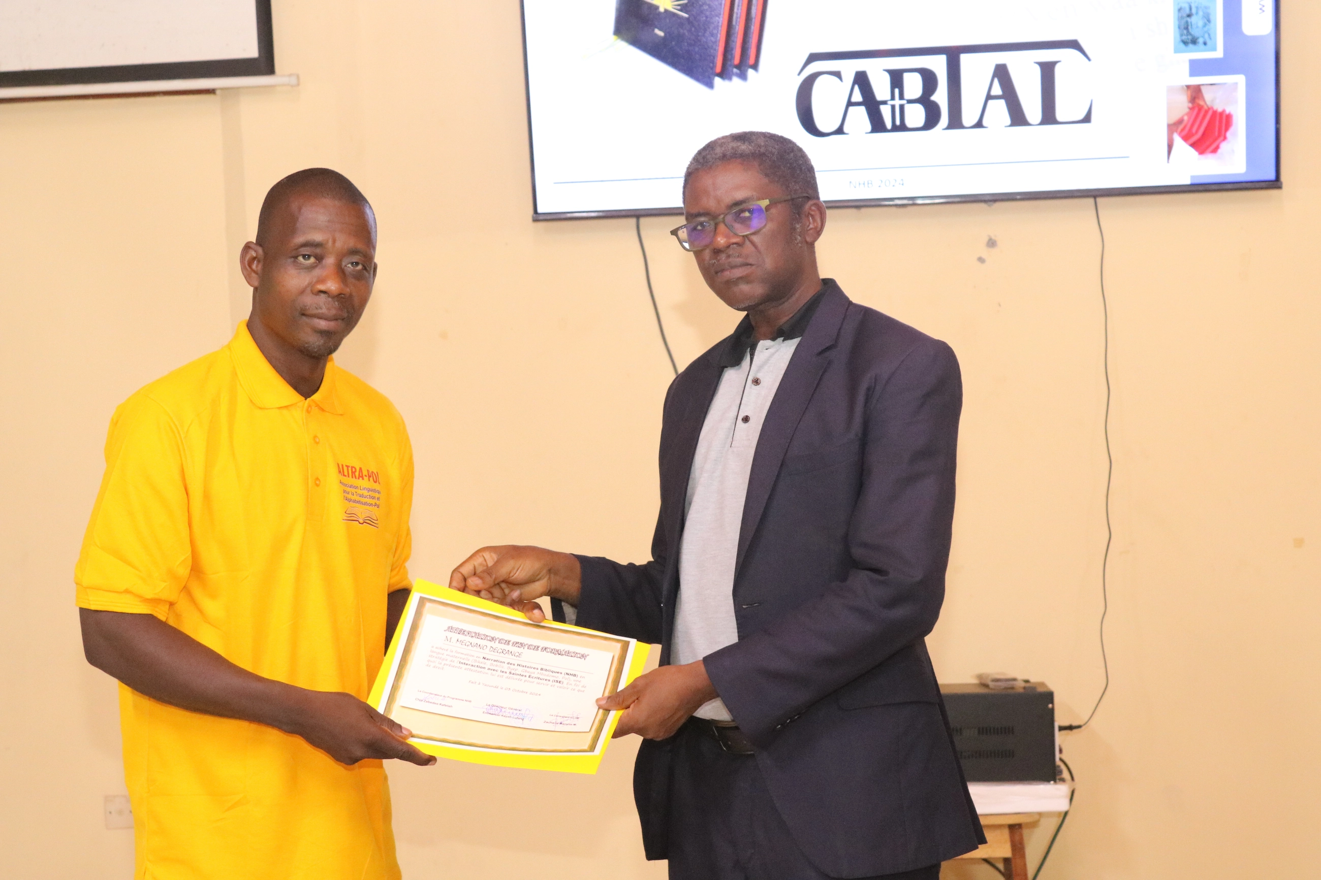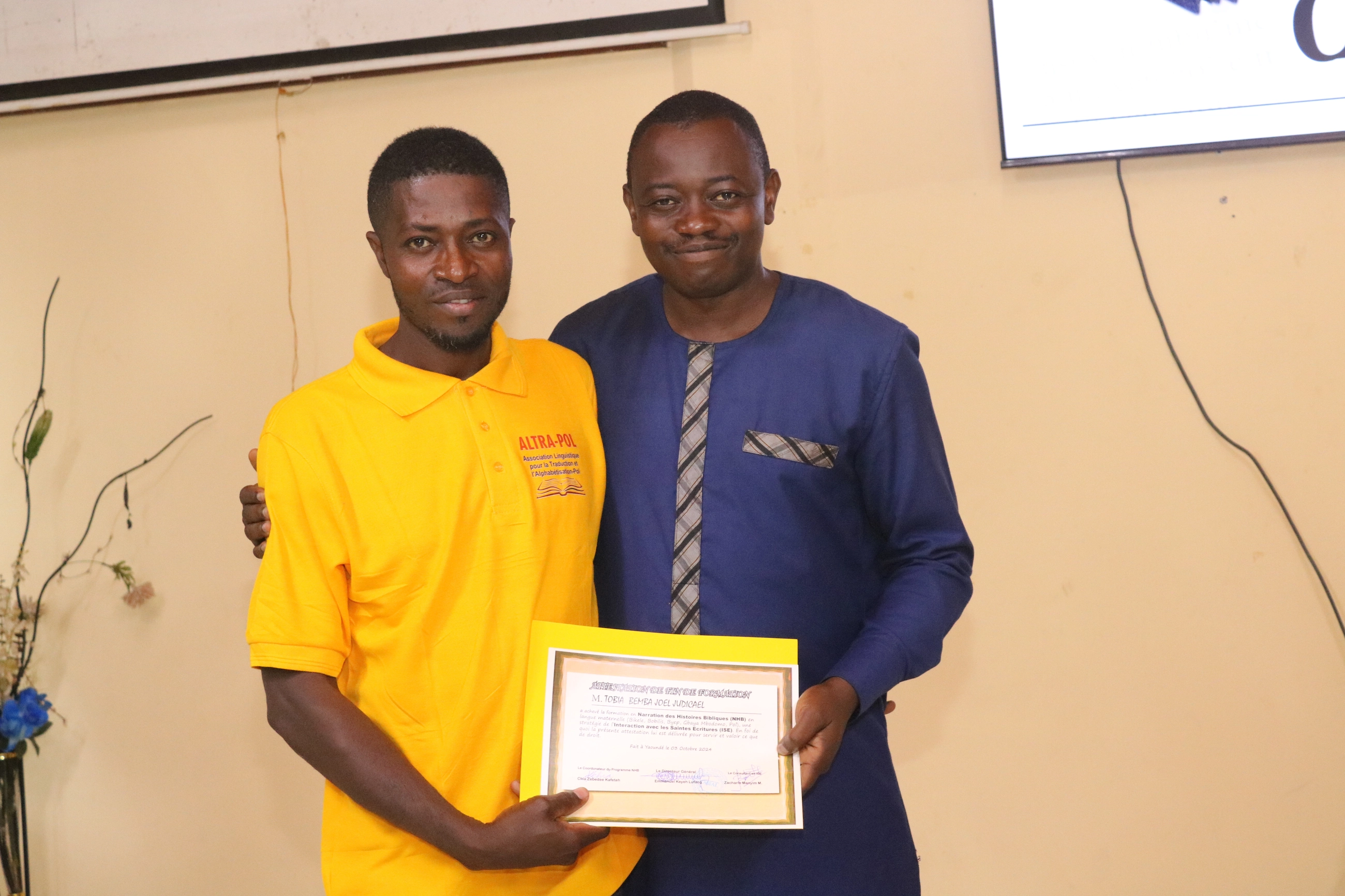 Aprés avoir suivit les formations par les formateurs échelonnés de la CABTAL pendant près de 02 (deux) ans, nous avons reçu différentes types de formations sur différents domaines tels que les techniques de Traductions, sur Paratext etc... les noms suivants ont été jugés apte de recevoir leurs attestation de fin de formation pour etre declaré Traducteurs de l'association ALTRAPOL.